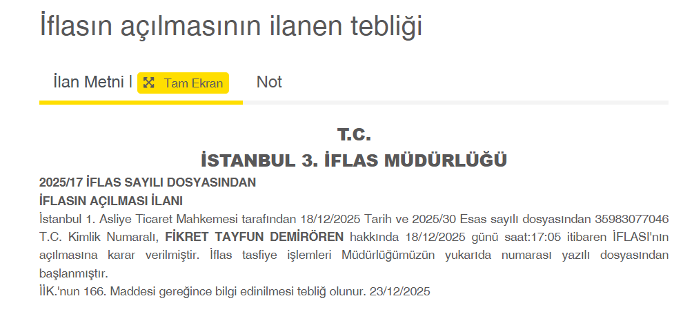 İlan.gov.tr’de yayınlanan son karara göre iş adamı Fikret Tayfun Demirören iflas etti. İstanbul 1’inci Asliye Ticaret Mahkemesi, Demirören hakkında iflasın açılmasına karar verdi. İflas süreci ise İstanbul 3’üncü İflas Müdürlü tarafından yürütülmeye başlandı.