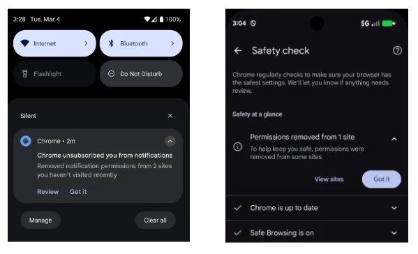 Bu özellikle beraber rahatsız edici site bildirimleri sona erecek. Tarayıcı, bildirimlerin iptal edildiğine dair bir uyarı gönderecek. Bir sitenin izinleri iptal edildiğinde, kullanıcı bu izinleri Güvenlik Kontrolü üzerinden veya doğrudan ilgili siteye giderek yeniden etkinleştirebilecek. İstenildiği takdirde, bu otomatik bildirim kapatma özelliği devre dışı bırakılabilecek.
