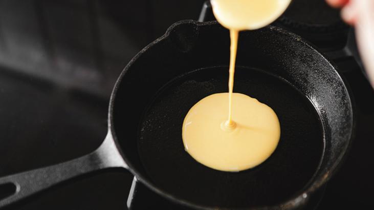 Kepçe yardımıyla hamurdan alın, tavaya dökerek ince bir tabaka halinde yayın. Alt yüzeyi renk alınca çevirin ve diğer tarafını kısa süre pişirin. Sıcak servis edin. Üzerine tereyağı sürebilir ya da sevdiğiniz tatlı/tuzlu malzemelerle tamamlayabilirsiniz.