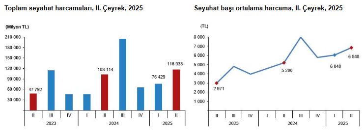 Yerli turistlerin yurt içinde yaptığı seyahat harcamalarının tutarı yüzde 13,4 artarak 116 milyar 933 milyon 487 bin liraya yükseldi. Bu harcamaların yüzde 85,2’si kişisel harcamalardan oluşurken, yüzde 14,8’i paket turlara ayrıldı. Seyahat başına yapılan ortalama harcama miktarı ise 6 bin 848 lira olarak kaydedildi.