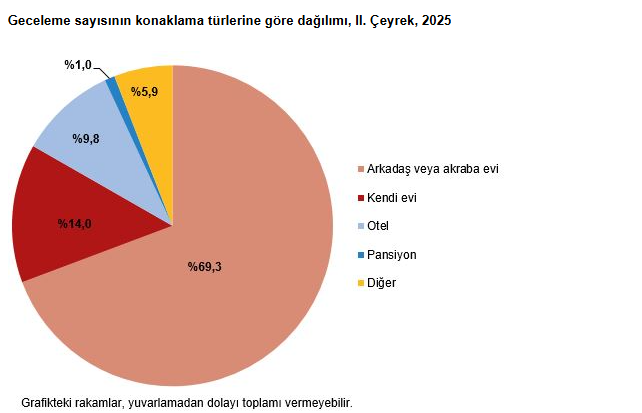 İkinci çeyrekte seyahate çıkanların büyük çoğunluğu, 68 milyon 739 bin geceyi “arkadaş veya akraba evinde” geçirdi. Bunun yanı sıra, yüzde 32,2 gezi, eğlence ve tatil amaçlı konaklamayı tercih ederken, yüzde 3’lük bir kısım da sağlık turizmine katıldı.